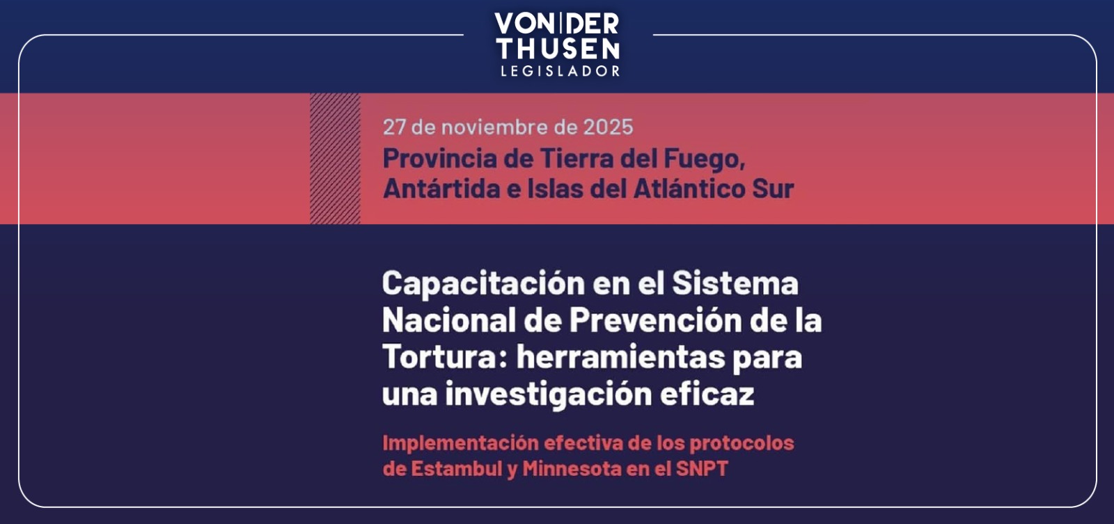 En este sentido, presentamos un proyecto de ley para Declarar de Interés Provincial la “CAPACITACIÓN EN EL SISTEMA NACIONAL DE PREVENCIÓN DE LA TORTURA: HERRAMIENTAS PARA UNA INVESTIGACIÓN EFICAZ – Implementación efectiva de los Protocolos de Estambul y Minnesota”, que se llevará adelante el 27 de noviembre este año en la ciudad de Ushuaia.